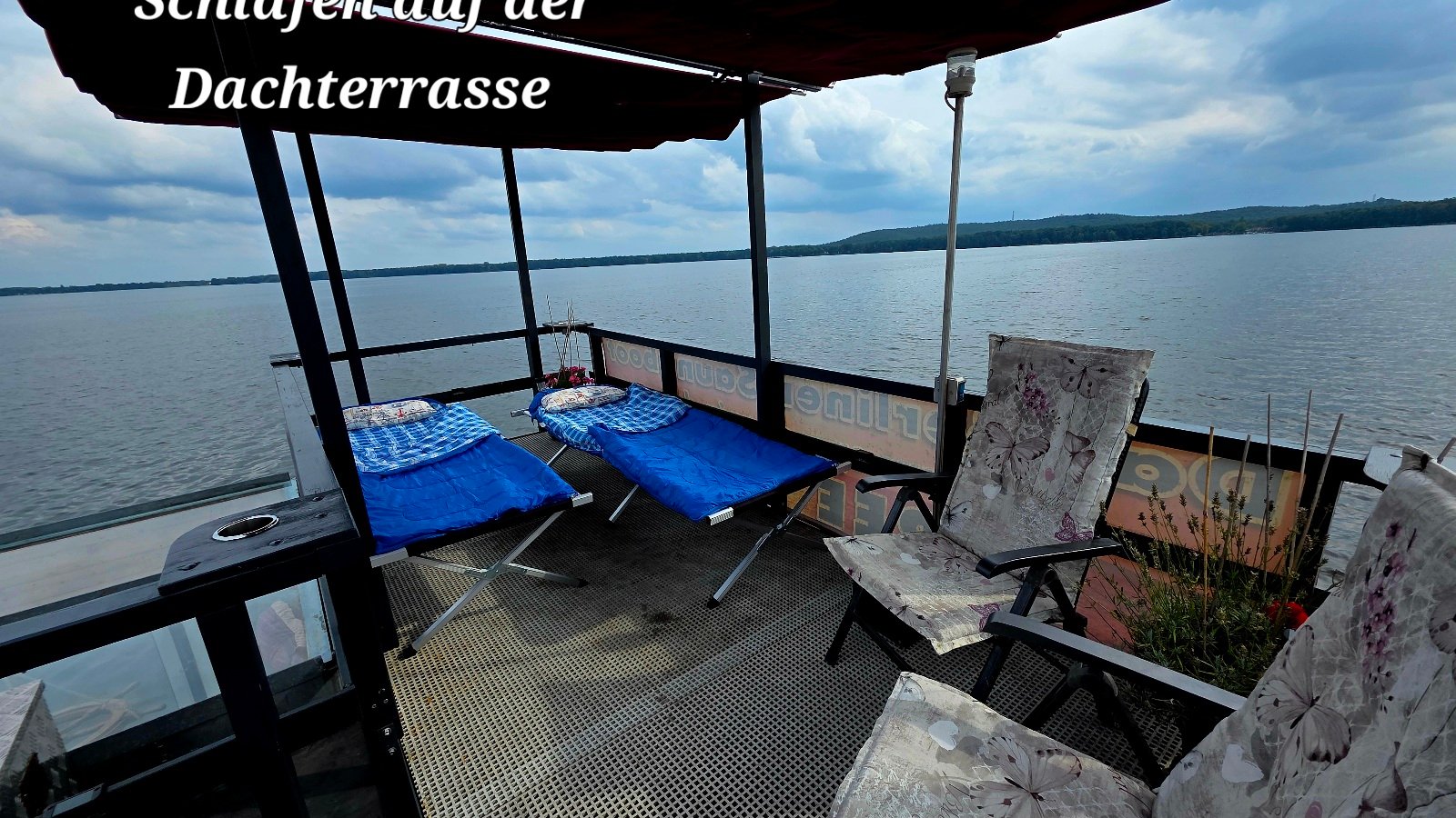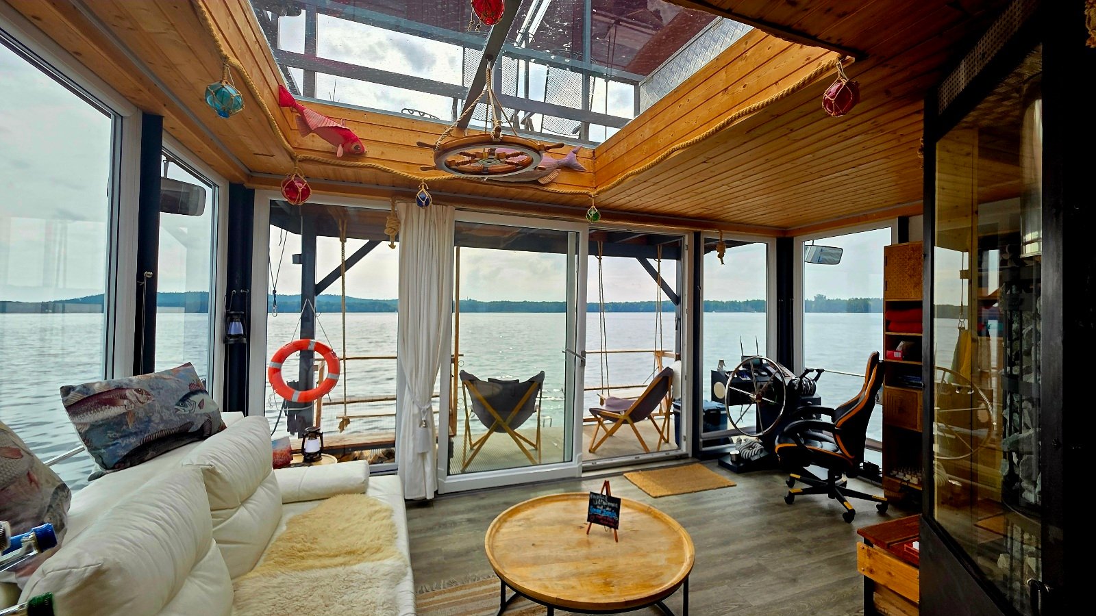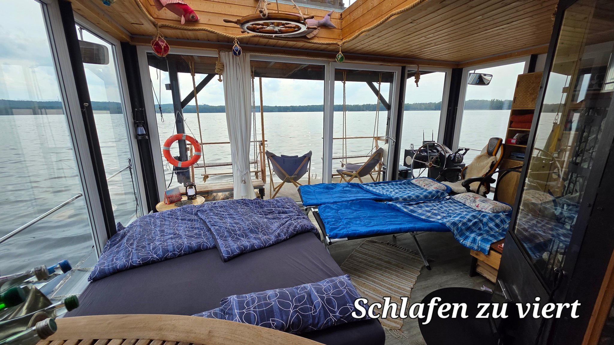 Die 9 Meter lange Glasfront im Ruheraum bietet einen fantastischen Blick über den See. Das Panorama-Dachfenster über der Couch lässt außerdem einen Blick in den (Sternen-) Himmel zu. Neben der Couch mit Schlaffunktion stehen weitere Sitz-, & Liegemöglichkeiten zur Verfügung. Die Lichtgestaltung, mit Farbauswahl, sorgt für eine entspannte Atmosphäre. Dazu stehen Teller, Tassen, Gläser, Besteck und Kühlbox für die mitgebrachten Speisen zur gratis Verfügung.