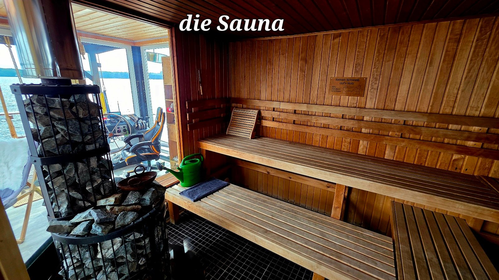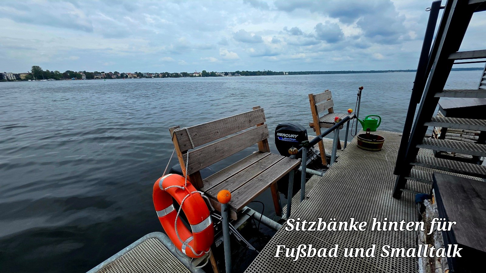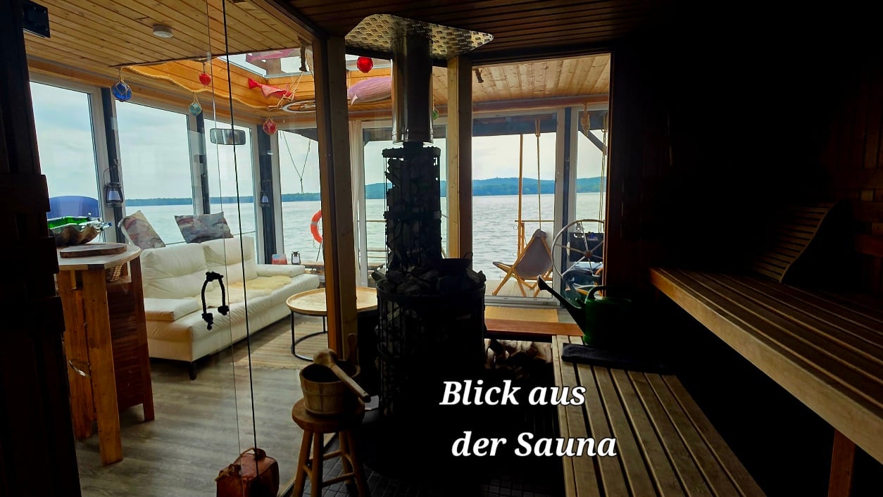 Nach dem Saunagang winken am Heck 2 Badeplattformen und breite Treppe in den See zur Abkühlung. Hier kann man auch ein wärmendes, prickelndes oder entspanntes Fußbad nehmen. Verschiedene Fußbadzusätze stehen dafür zur Verfügung.