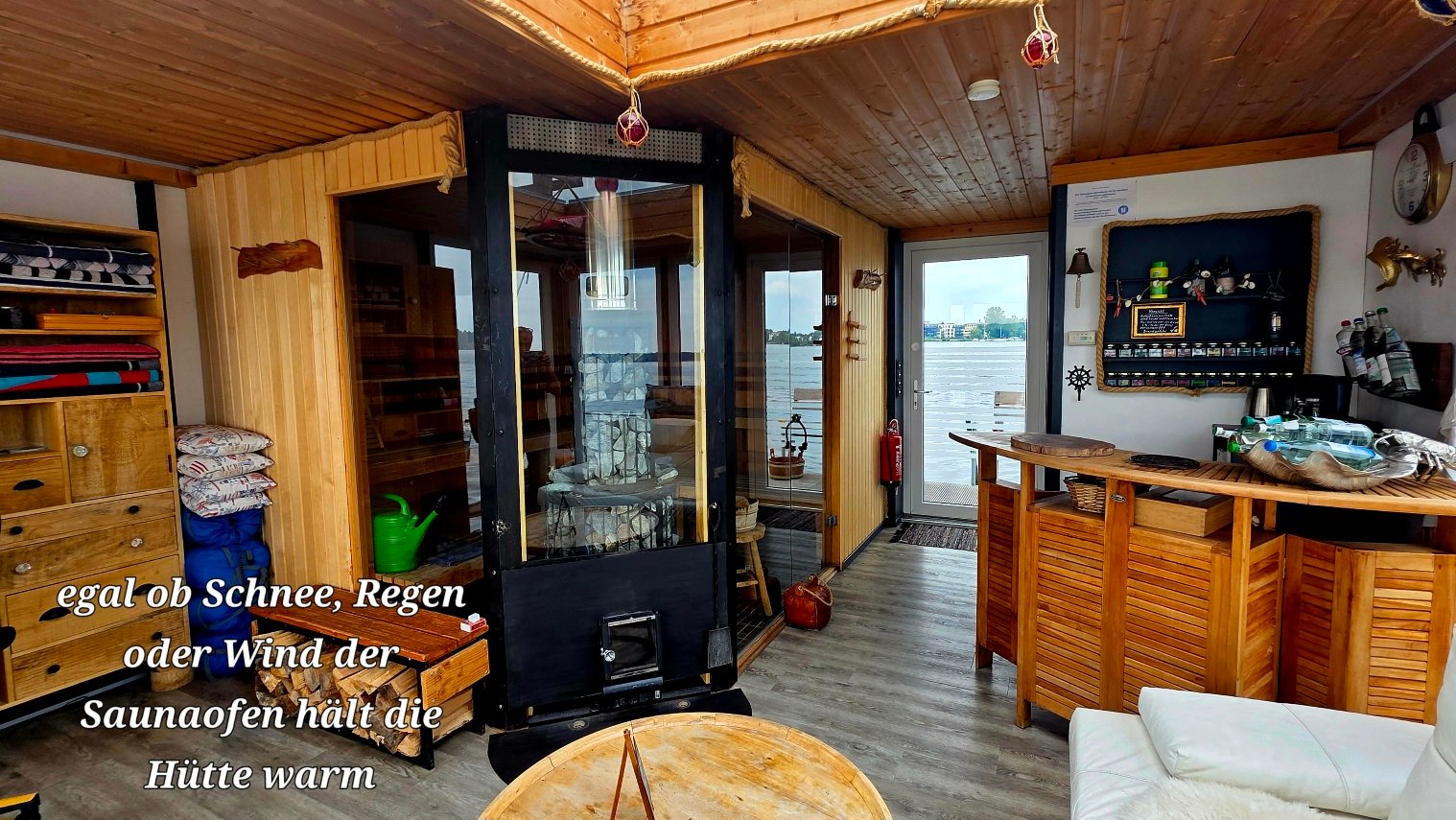 Die große Glaswand und eine steuerbare Farblichtinstallation runden dieses Wohlfühlareal ab. Der Saunaofen mit Kamin - beheizt dabei das gesamte Boot. Daher ist die SpreeBanja besonders im Winter eine Oase der Entspannung.