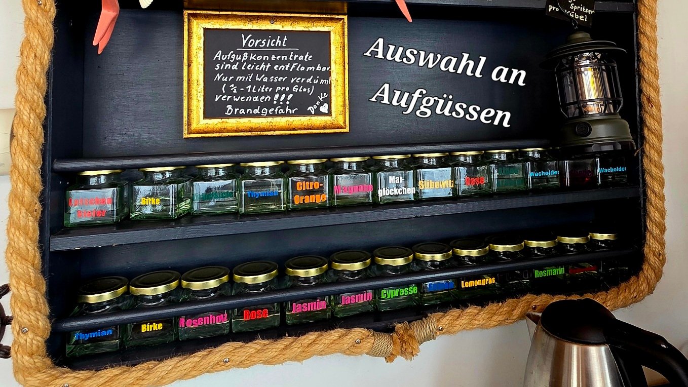 Es sind mindestens 10 verschiedene Aufgussdüfte gratis an Bord. Oder man stellt einfach eine Schale mit Wasser und Zusatz auf die Saunasteine.